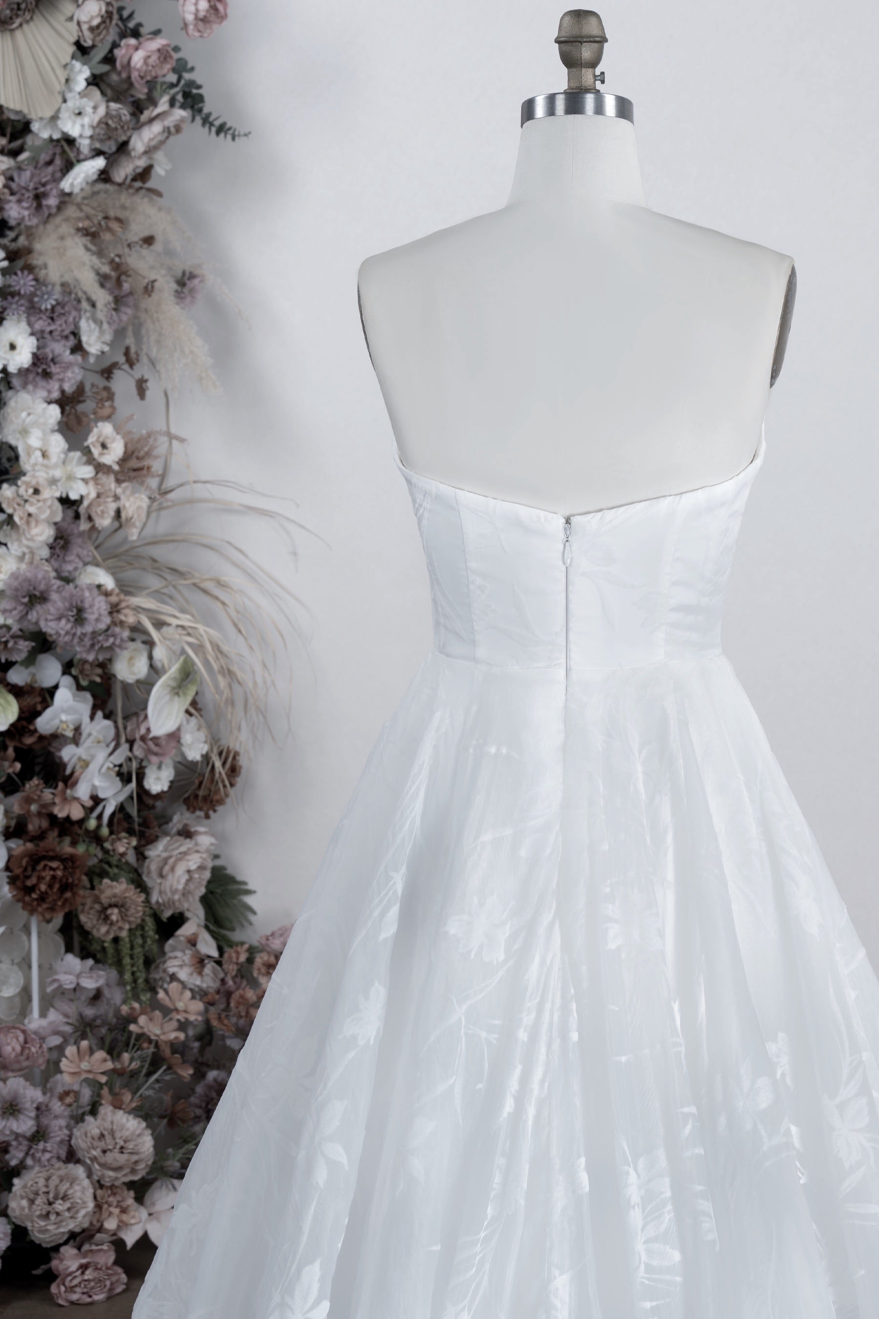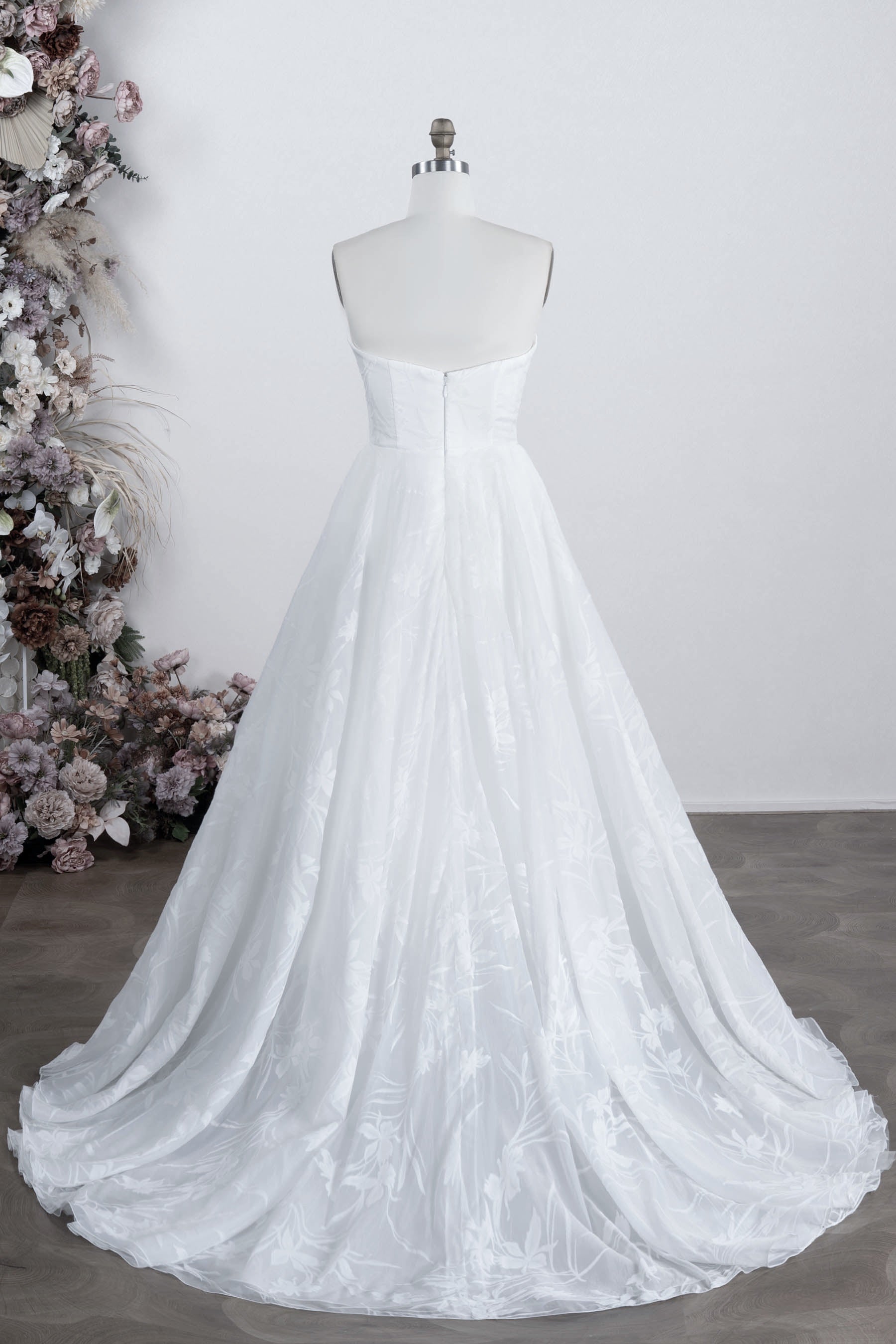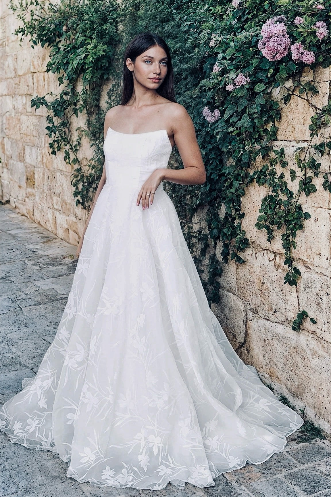 Step into timeless elegance with our breathtaking Floral Velvet Organza A-Line Wedding Dress. This exquisite strapless bridal gown is designed for the modern bride who dreams of a romantic and sophisticated look on her special day.