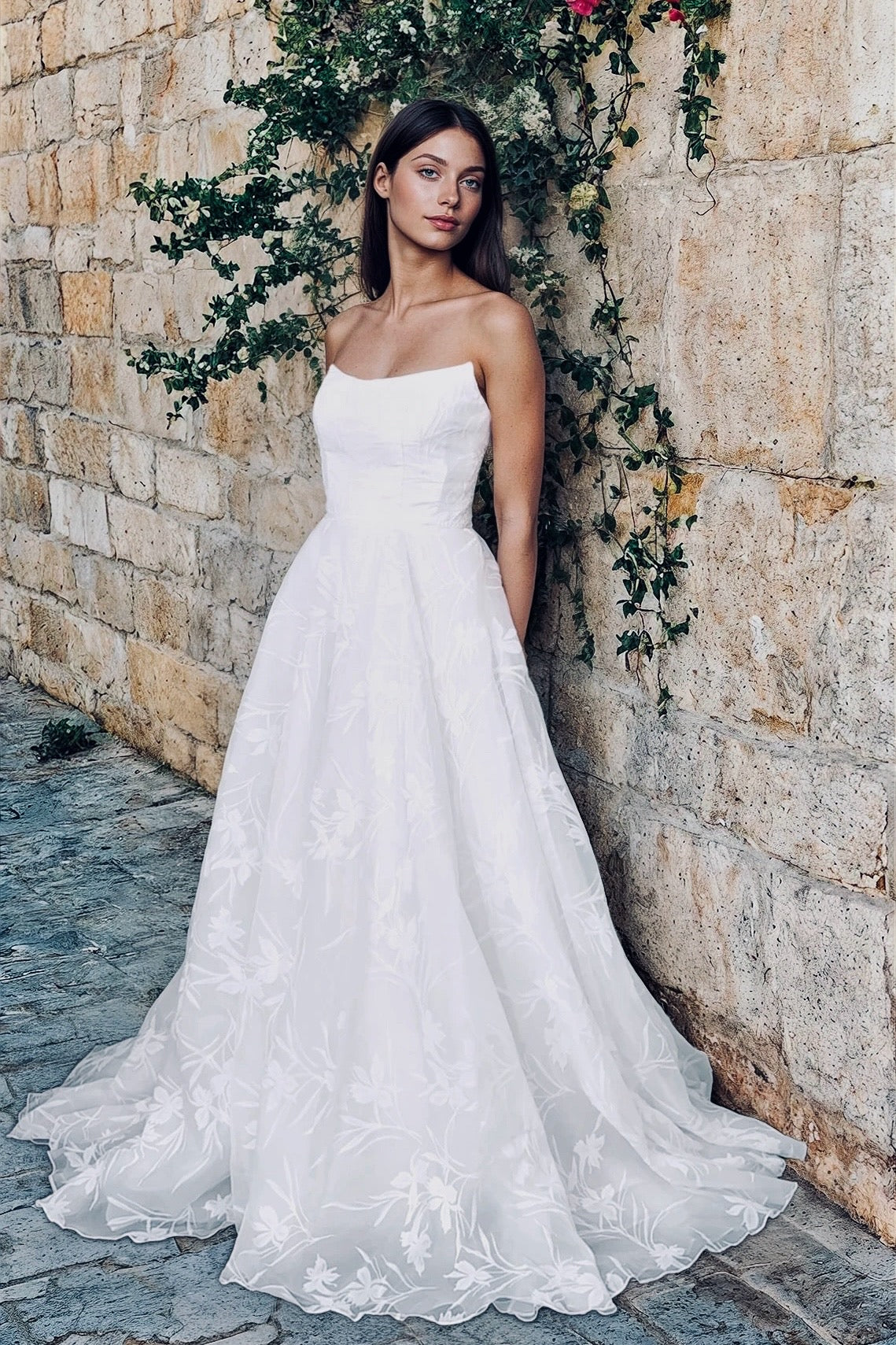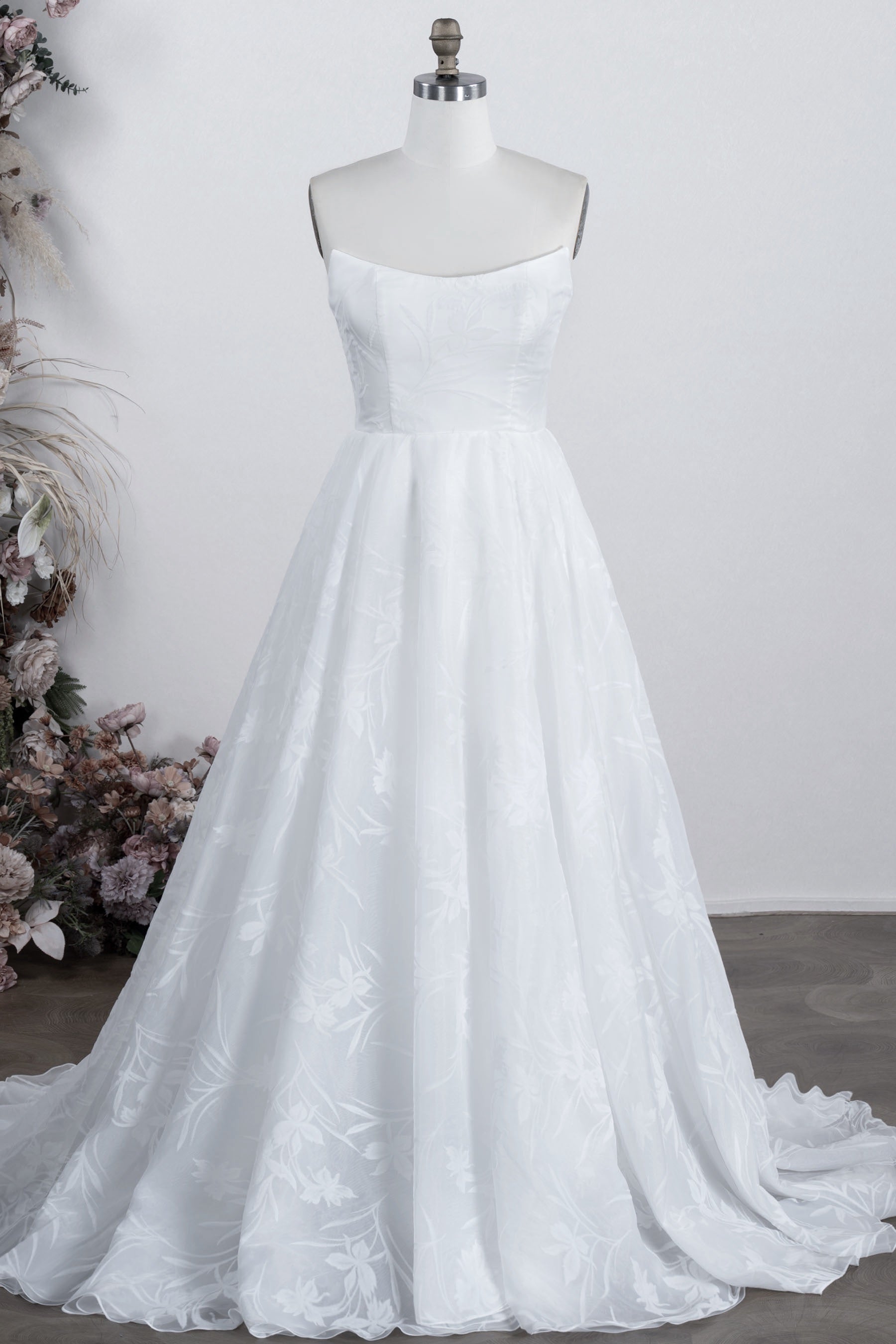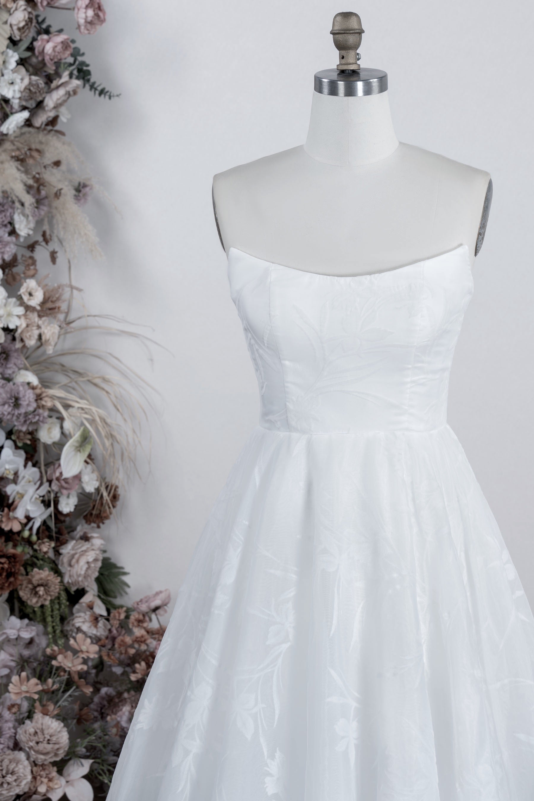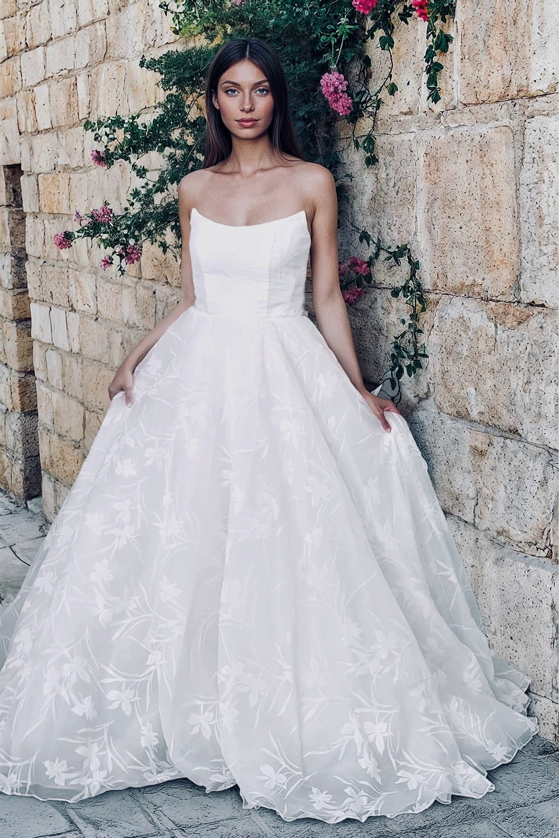Step into timeless elegance with our breathtaking Floral Velvet Organza A-Line Wedding Dress. This exquisite strapless bridal gown is designed for the modern bride who dreams of a romantic and sophisticated look on her special day.
