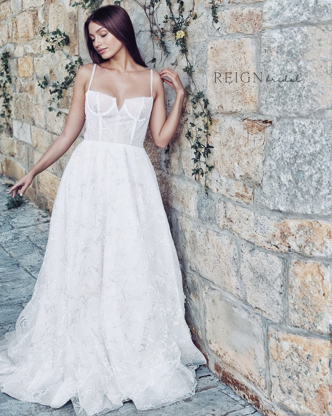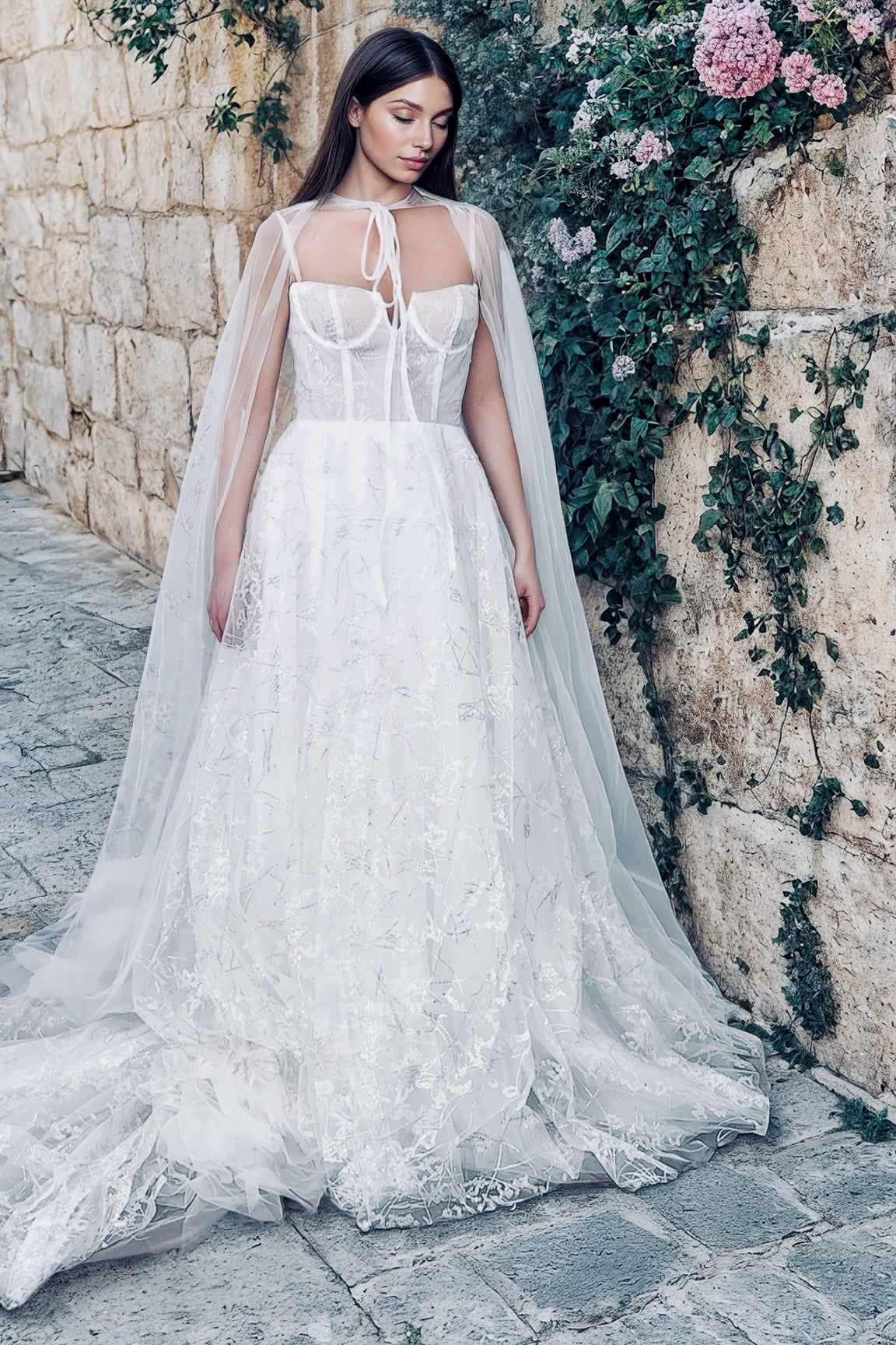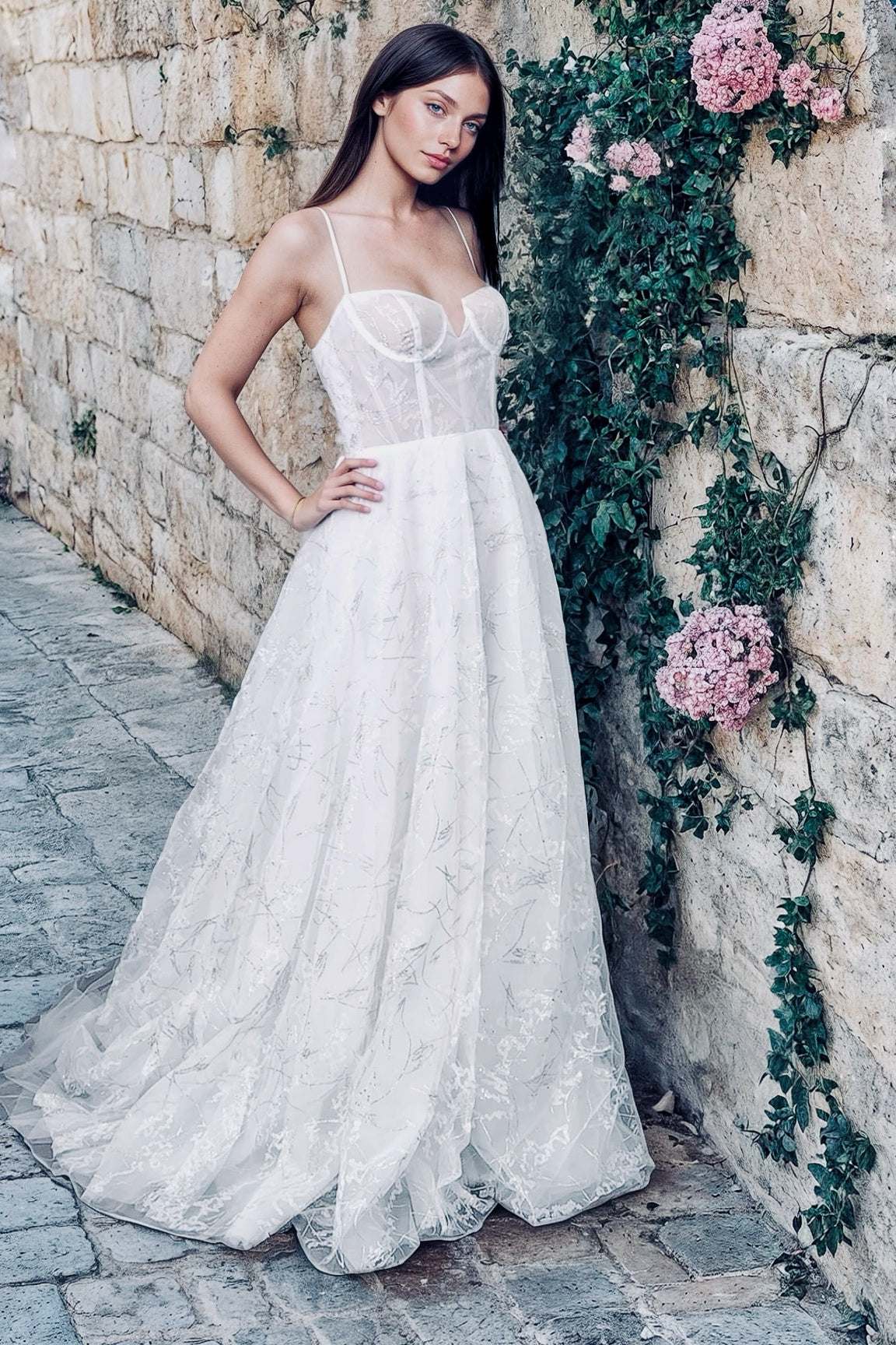 The flattering A-line silhouette gracefully defines the waist and flows into a full, airy skirt, ensuring both elegance and comfort. The sophisticated sweetheart neckline is adorned with subtle, tulle straps, providing a secure fit while highlighting your décolletage beautifully. The bustier-style bodice features delicate, almost translucent detailing, adding a modern and alluring touch.